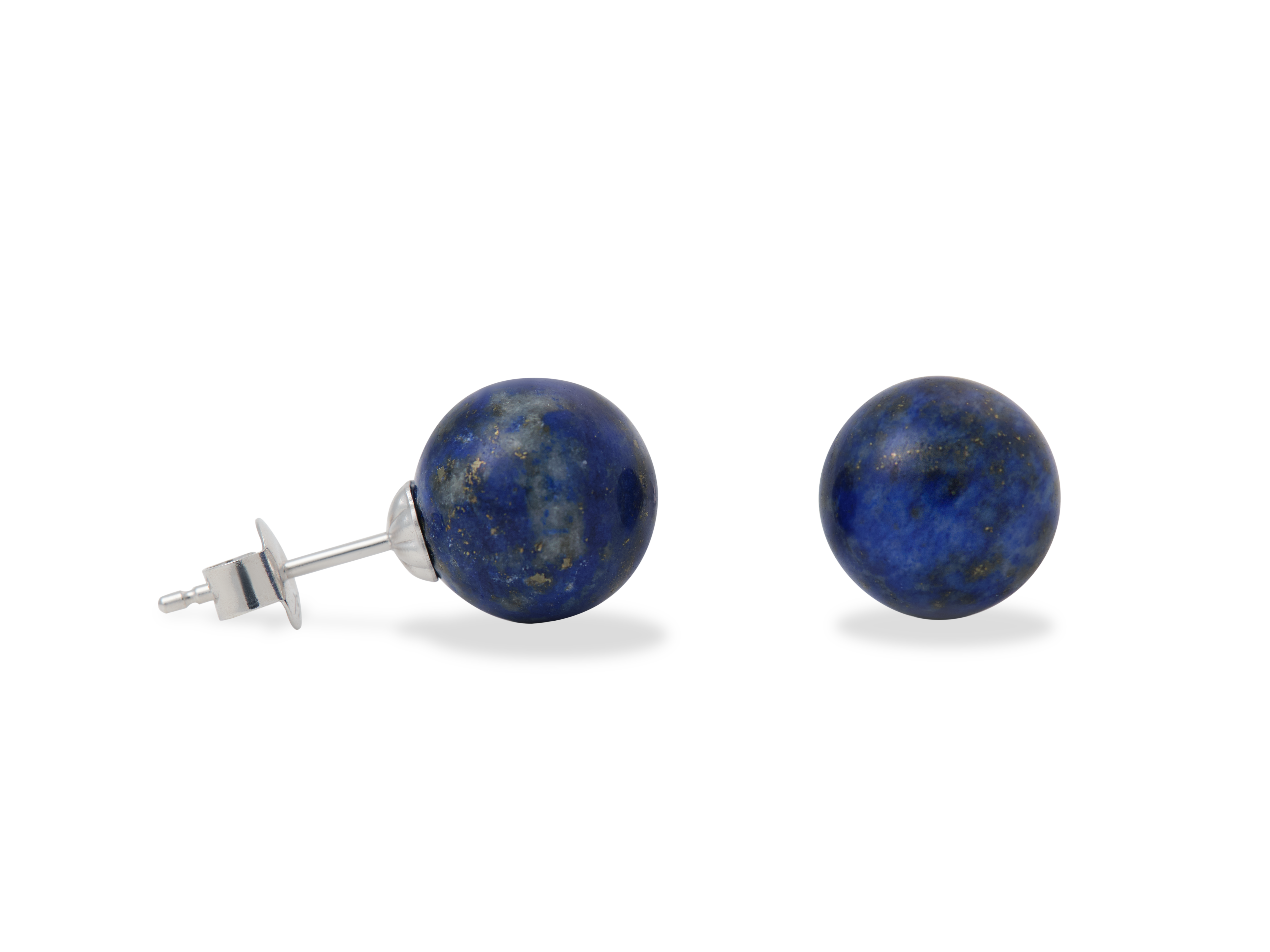 Round Lapis Lazuli earrings 10mm with 18k white gold posts, including 18k white gold butterfly backs. Product of Israel.